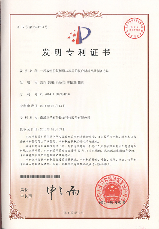 2016年2月18日,南通三圣石墨設(shè)備科技股份有限公司收到國家知識產(chǎn)權(quán)局的發(fā)明專利證書,該公司的發(fā)明專利"一種雙組份氟樹脂與石墨的復合材料及其制備方法"獲得了國家授權(quán)。該項專利涉及一種完全意義上的新型氟-石墨復合材料,該復合材料既具有石墨優(yōu)良的導熱性能,又具有優(yōu)異的耐腐蝕性能,由該種材料制成的換熱設(shè)備可用于強腐蝕工況條件下的換熱,打破了此前常規(guī)設(shè)備滲透壓力耐受瓶頸,實現(xiàn)了鋼鐵酸洗工序上酸液換熱設(shè)備的國產(chǎn)化。