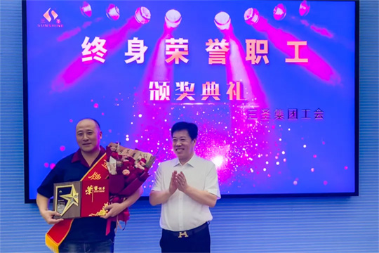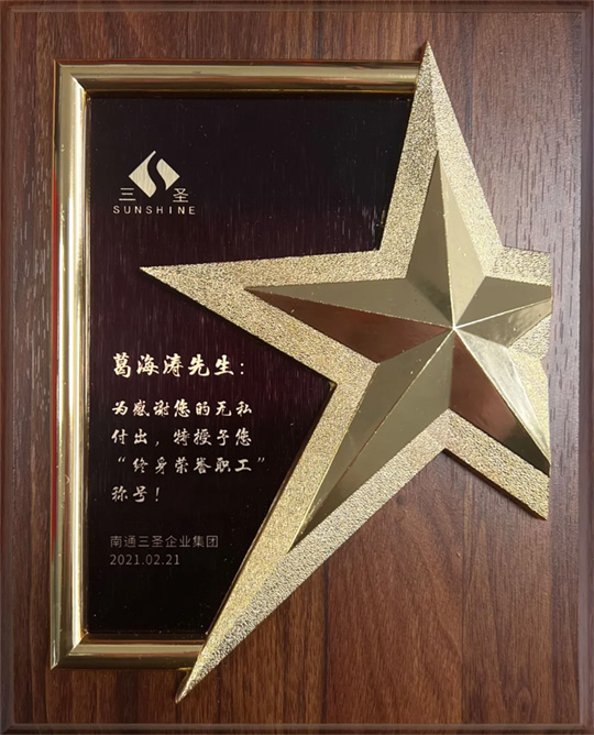 三圣奮斗史中閃耀著這樣一顆璀璨之星,他以堅(jiān)定的信念和不懈的努力,登上榮譽(yù)巔峰,成為開發(fā)區(qū)當(dāng)之無愧的一名“金牌員工”,并被三圣集團(tuán)董事會(huì)、三圣工會(huì)授予“終身榮譽(yù)職工”的光榮稱號。
